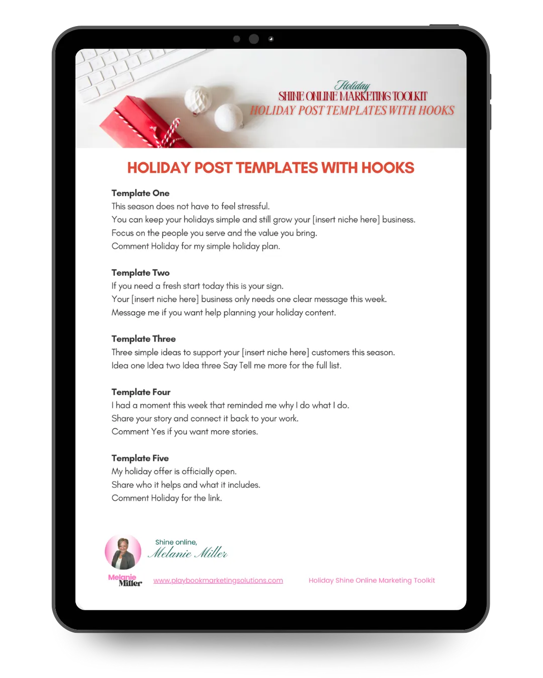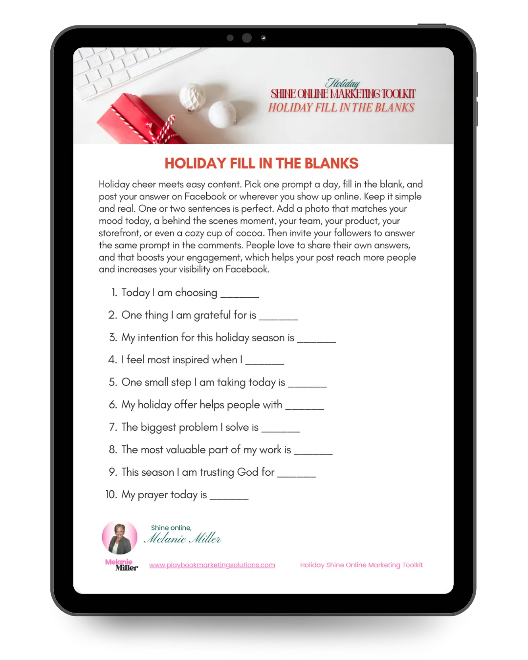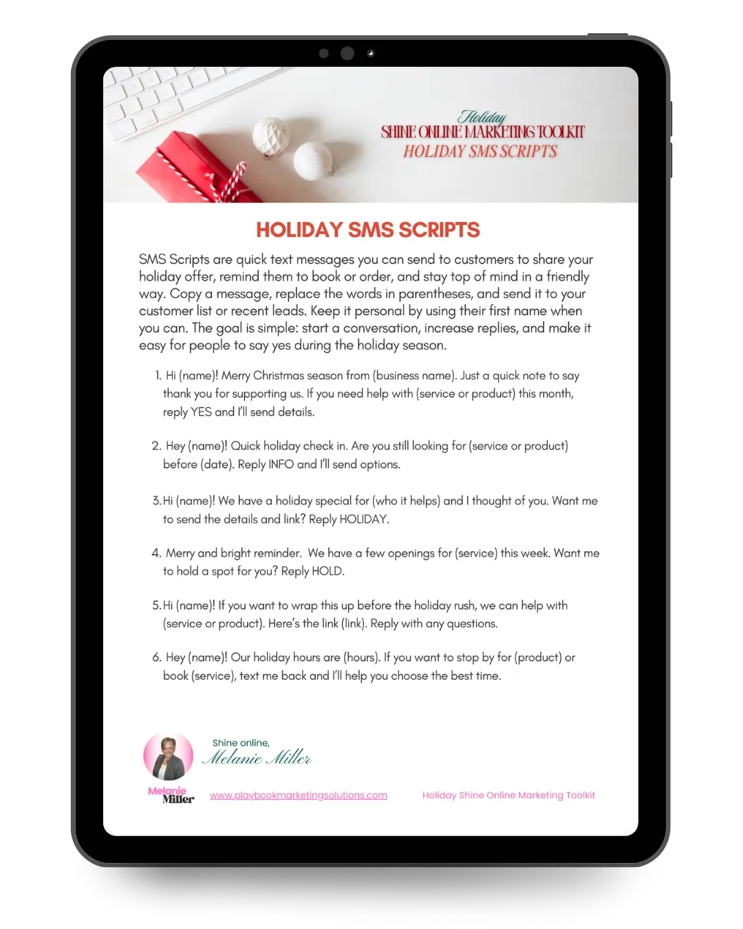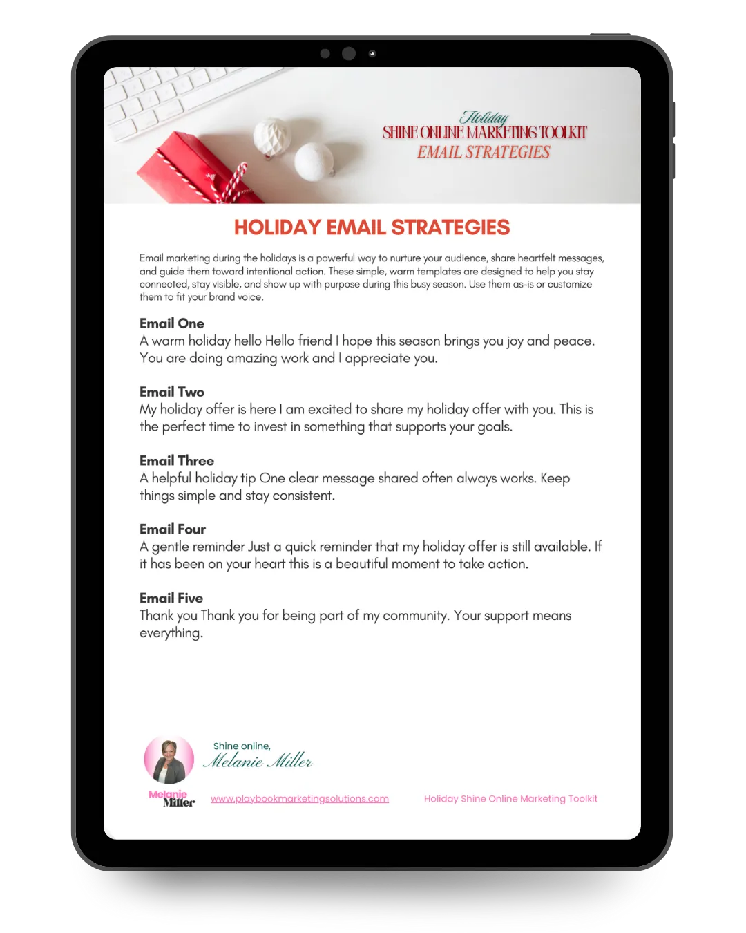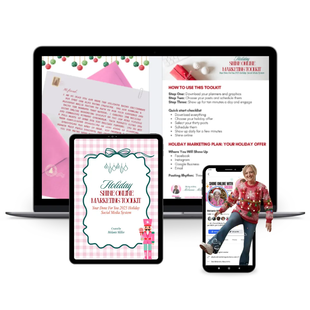 The holiday season is your busiest, brightest, and most profitable time of year but it can also be overwhelming. That’s why the Holiday Shine Online Marketing Toolkit was designed to give you everything you need to show up consistently and confidently in just minutes a day.